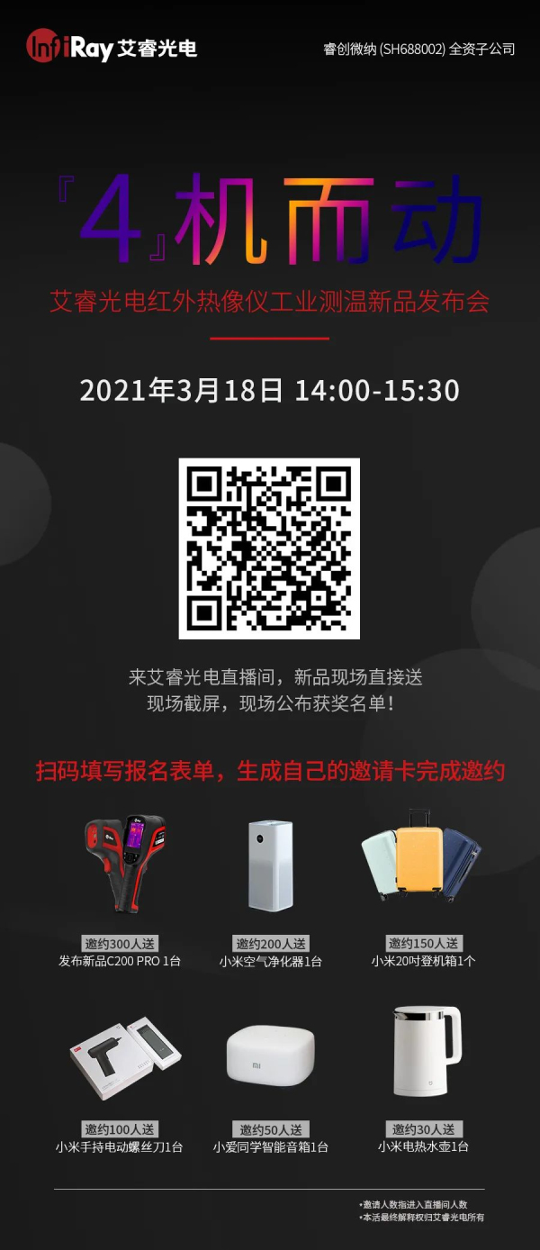 3月18日,艾睿光电将举办红外热像仪工业测温新品发布会活动,欢迎您的参与!